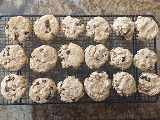 3. Place scoops of dough (I use a 1-oz. cookie scoop--about 2 Tbsp.) on a greased cookie sheet (or sheet with silicon baking liners). Flatten the dough balls a bit with the palm of your clean hand, or the back of a glass. Bake for 12-15 minutes, or until the edges just start to turn brown. Allow the cookies to cool on the sheet for a couple of minutes before transferring them to a wire rack to completely cool (if you can let them cool before you eat one).